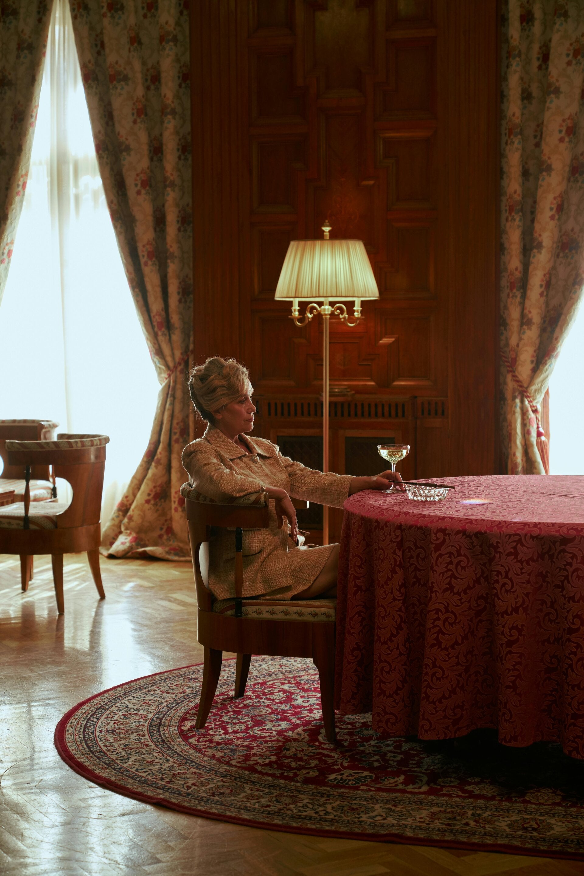 To his left, at my three o’clock, sat a sophisticated lady of indeterminate years, somewhere between forty and sixty, I would guess. She had honey blonde hair, caught up at the back in a large purple grip, and her long-sleeved tailored dress was of the same hue.